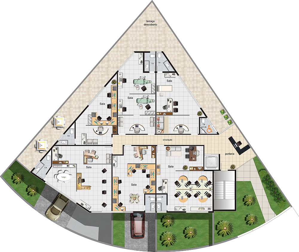 O empreendimento conta com um total de 1.800 m², de área útil total construída, em terreno de 700 m², com 5 andares , sendo 3 andares contendo salas comerciais e 2 andares com garagens.
